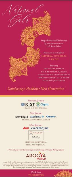 Momentum is building for our gala on Saturday, Oct 16, at 6 pm Central US time. We are excited and honored to have Michelin Starred Chef and one of the great humanitarians of our time Vikas Khanna participate in a fireside chat on healthy eating, especially important because it is World Food Day. And we are very pleased that Dr. K.M. Venkat Narayan from Emory University, representatives from Mission ICU and Sangath, as well as Arogya Board members, colleagues, and young Arogya Changemakers, will take part. Plus we have a fabulous magic show. Our emcee is Shraysi Tandon.