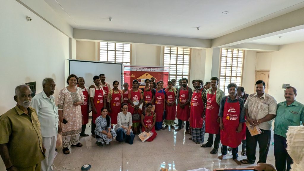 - At the end of the session, each vendor is presented with a certificate of completion, an informative flyer in Kannada highlighting tips for healthier cooking methods and usage of salt and oil, and a special MyThali apron.