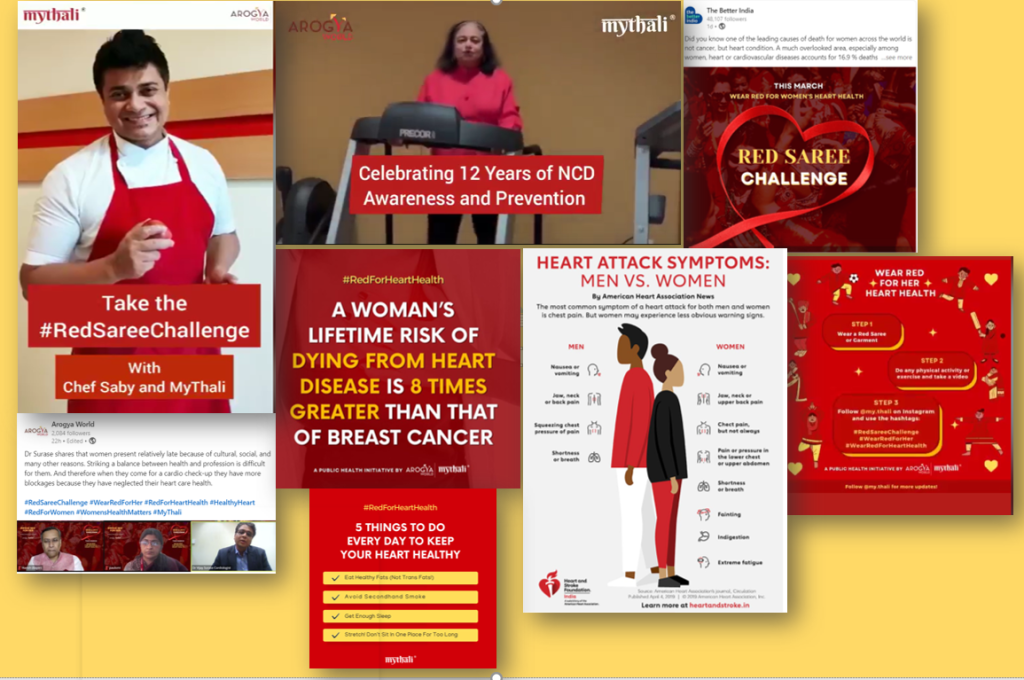 We believe that there is an urgent need to be aware of the risk factors, and immediately incorporate a healthy lifestyle to improve heart health. We know from WHO that 80% of heart disease can be prevented with 3 lifestyle changes – we must eat right, exercise and avoid tobacco, The Red Saree Challenge is an initiative run by Arogya World’s MyThali team. MyThali is Arogya World’s nutrition education tool that teaches consumers what to eat and in what quantities at each meal. We have run many nationwide campaigns including #HealthyWaliDiwali in 2021, to educate urban Indian women to improve both Poshan (nutrition) and manage Portion size.