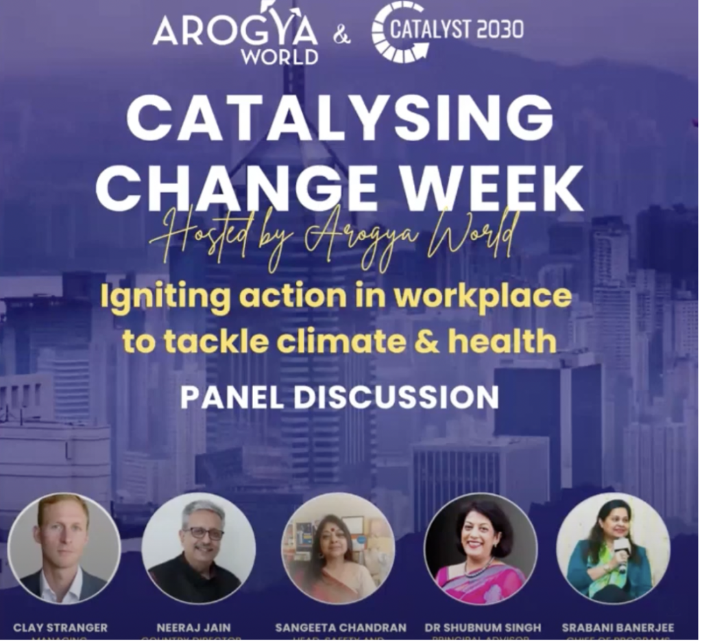 Last month, Arogya World and Catalyst 2030 organized a panel discussion on, “Igniting Action in Workplace to Tackle Climate & Health“. Clay Stranger, MD of Rocky Mountain Institute(RMI), and a well-known climate expert, opened the session. He discussed the impact of the global energy system on climate and health and highlighted the potential for clean energy solutions and the challenges posed by rapid urbanization. Clay also presented case studies demonstrating the benefits of clean technology adoption, including energy savings and improved workplace productivity and comfort. These examples showcased the opportunities for organizations to contribute to climate and health goals through clean energy, lighting, and mobility solutions.